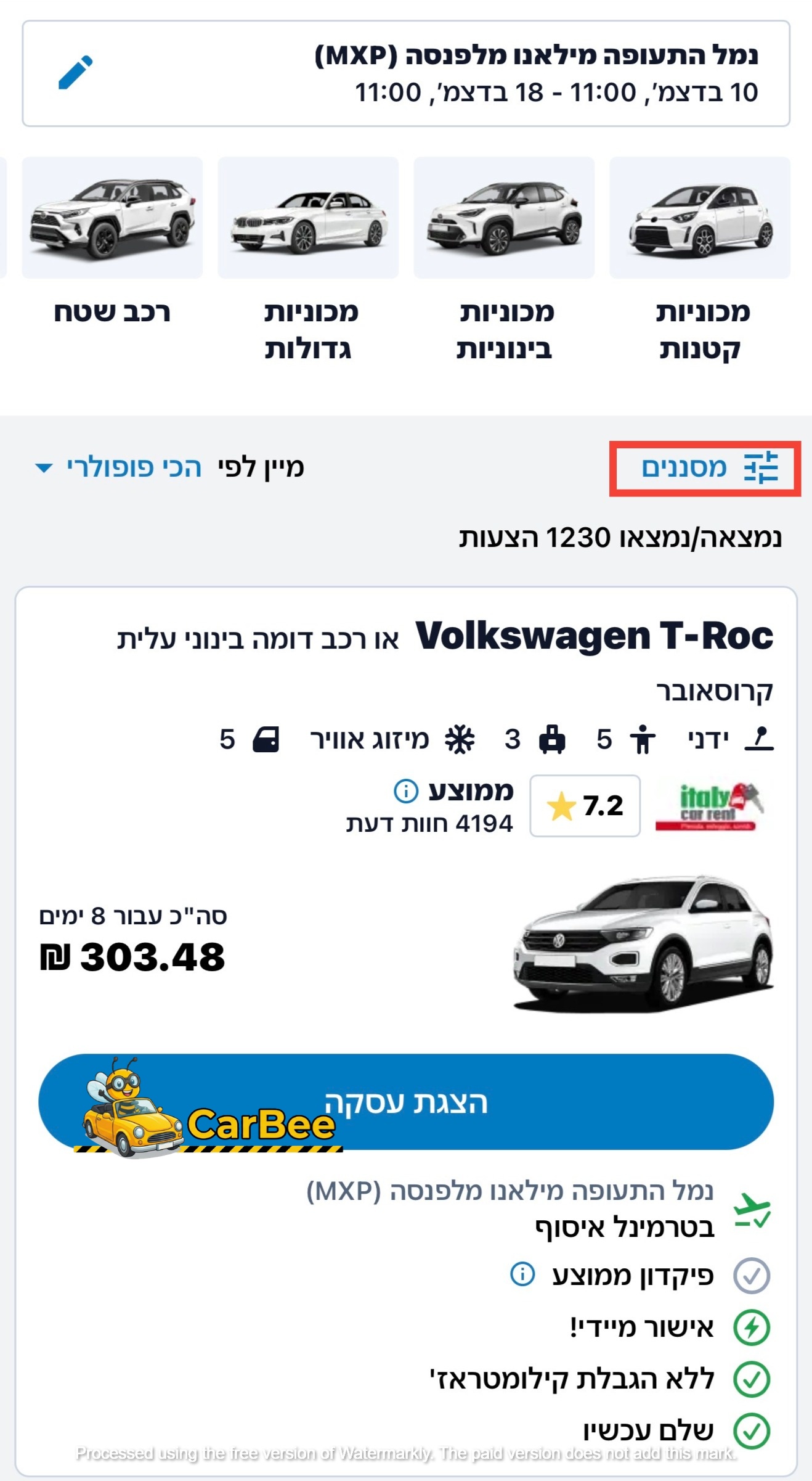 בירוק: אחרי שבחרתם הכול – לוחצים על "מצא רכב עכשיו" וממשיכים לשלב הבא.