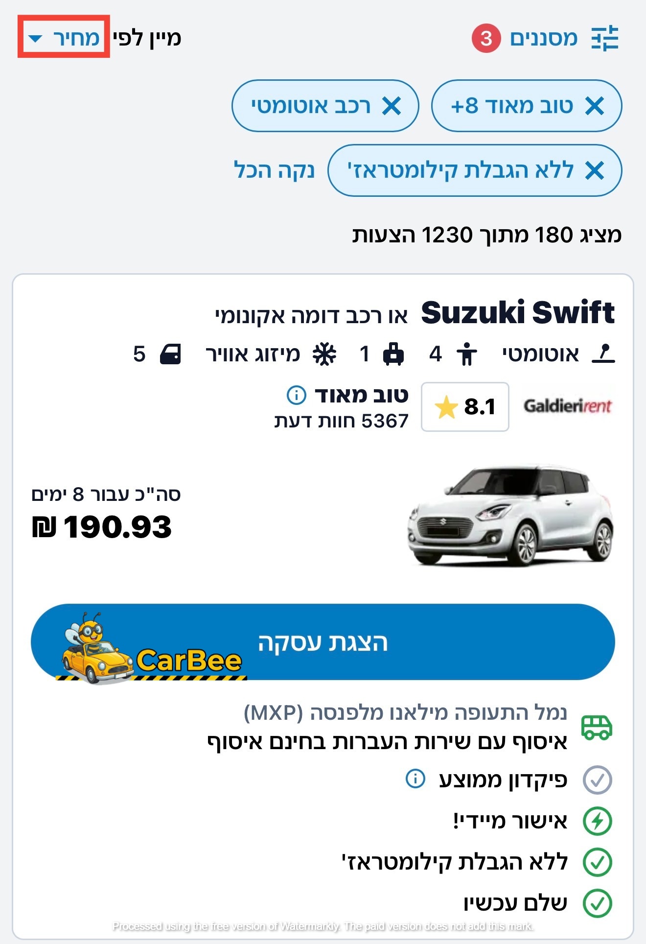 סינון לפי מחיר – מציג קודם את האפשרויות הזולות ביותר.