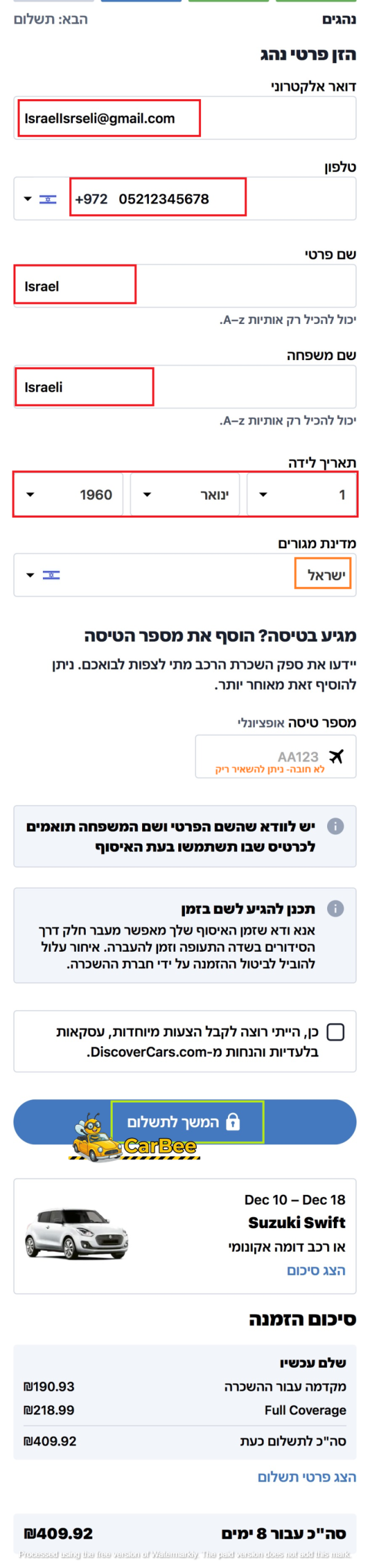 באדום: מילוי פרטים אישיים של מבצע ההזמנה והנהג הראשי ברכב